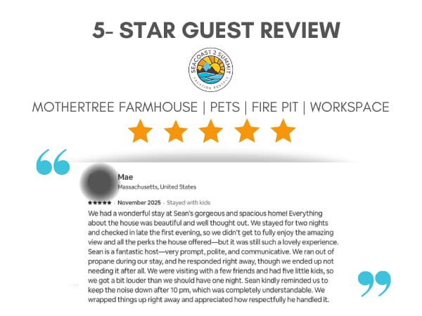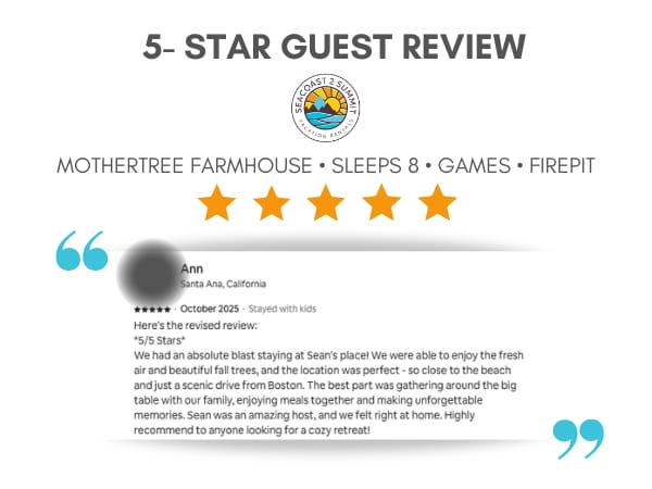 Here's the revised review: *5/5 Stars* We had an absolute blast staying at Sean's place! We were able to enjoy the fresh air and beautiful fall trees, and the location was perfect - so close to the beach and just a scenic drive from Boston. The best part was gathering around the big table with our family, enjoying meals together and making unforgettable memories. Sean was an amazing host, and we felt right at home. Highly recommend to anyone looking for a cozy retreat!
