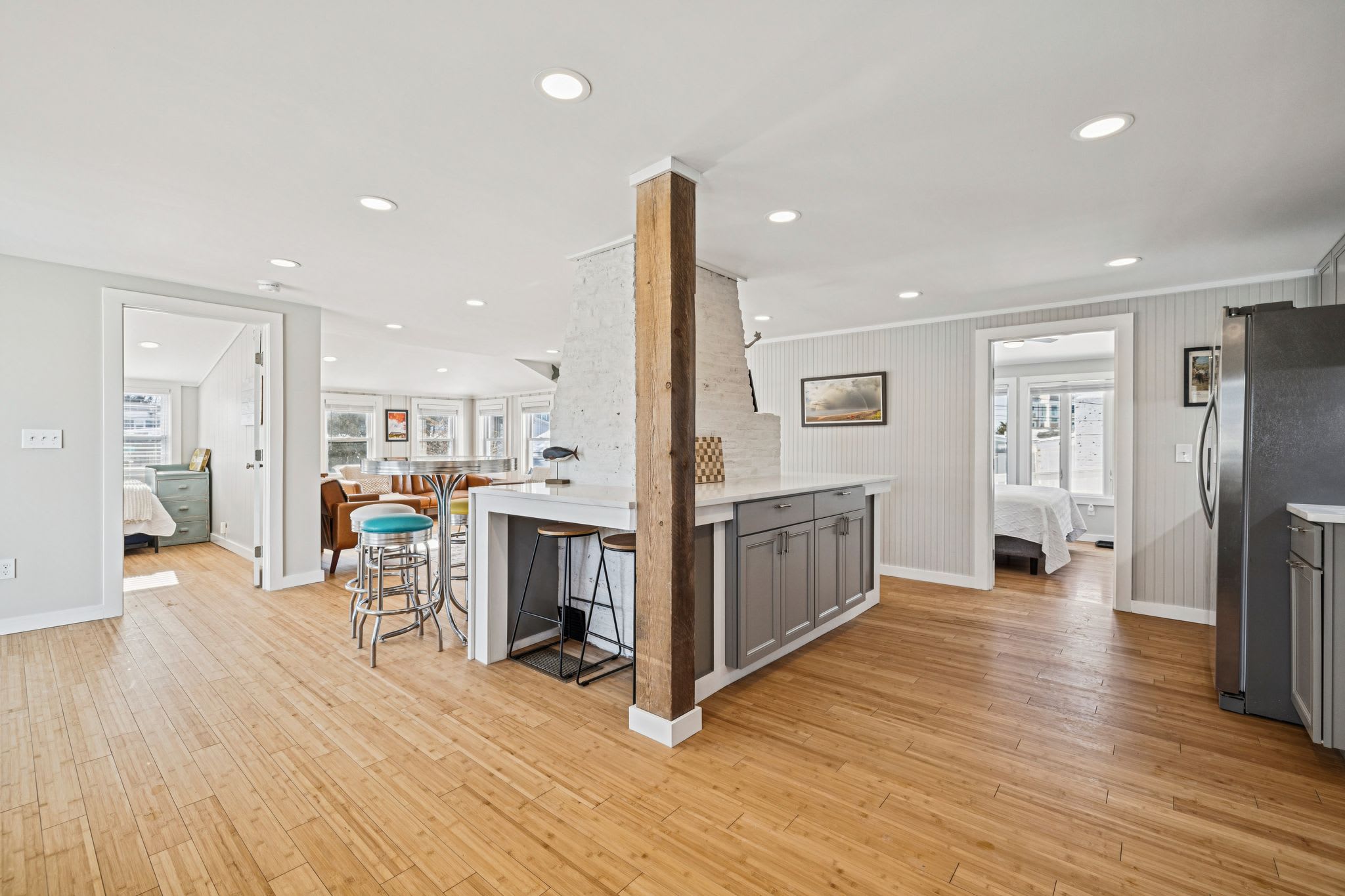 ✫ Barstool seating off the kitchen around the fireplace and a hightop table with seating for 3
