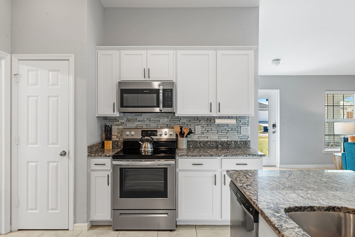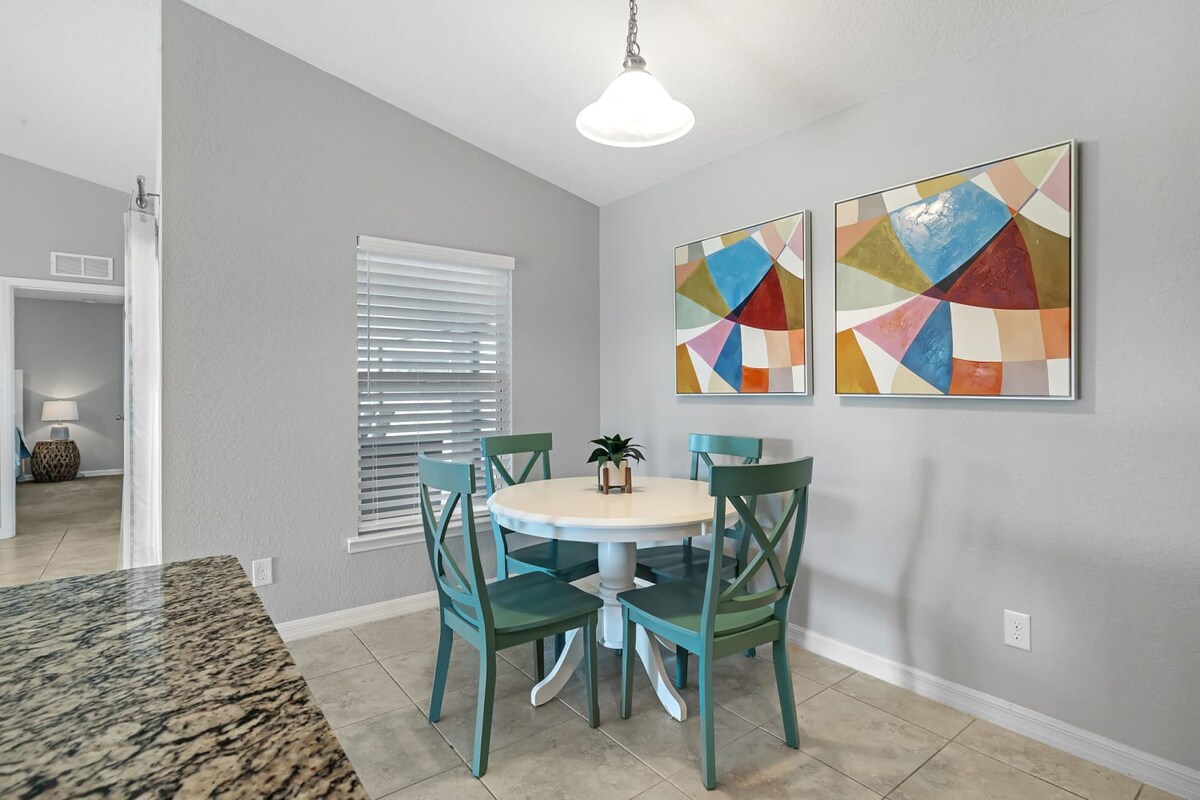 The Cape Escape is a newly built, clean, and modern single-level 3 bedroom, 2 full bathroom, 1,619 sqft single-level home in Northwest Cape Coral. Sleeps up to 7 with 1 king, 2 queens, and a standard living room sofa. Enjoy a screened lanai, fast Wi-Fi, two Roku smart TVs, washer/dryer, central A/C, and parking for up to 6 vehicles. Located in a quiet, walkable neighborhood. Up to 2 pets welcome (fees apply). No parties, no smoking. Guests must be 25+.