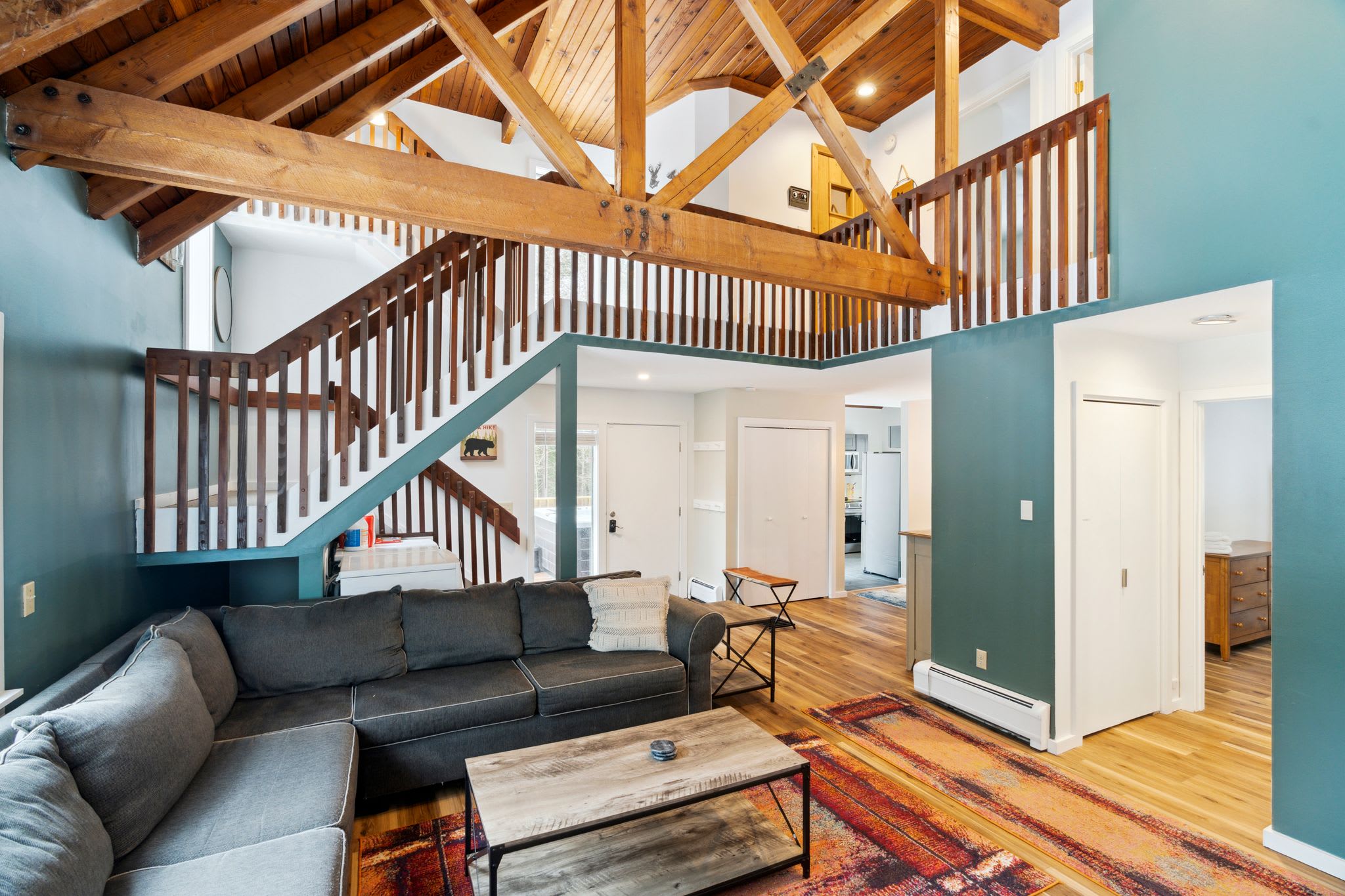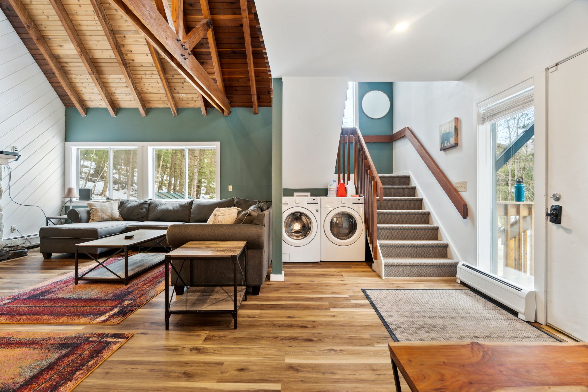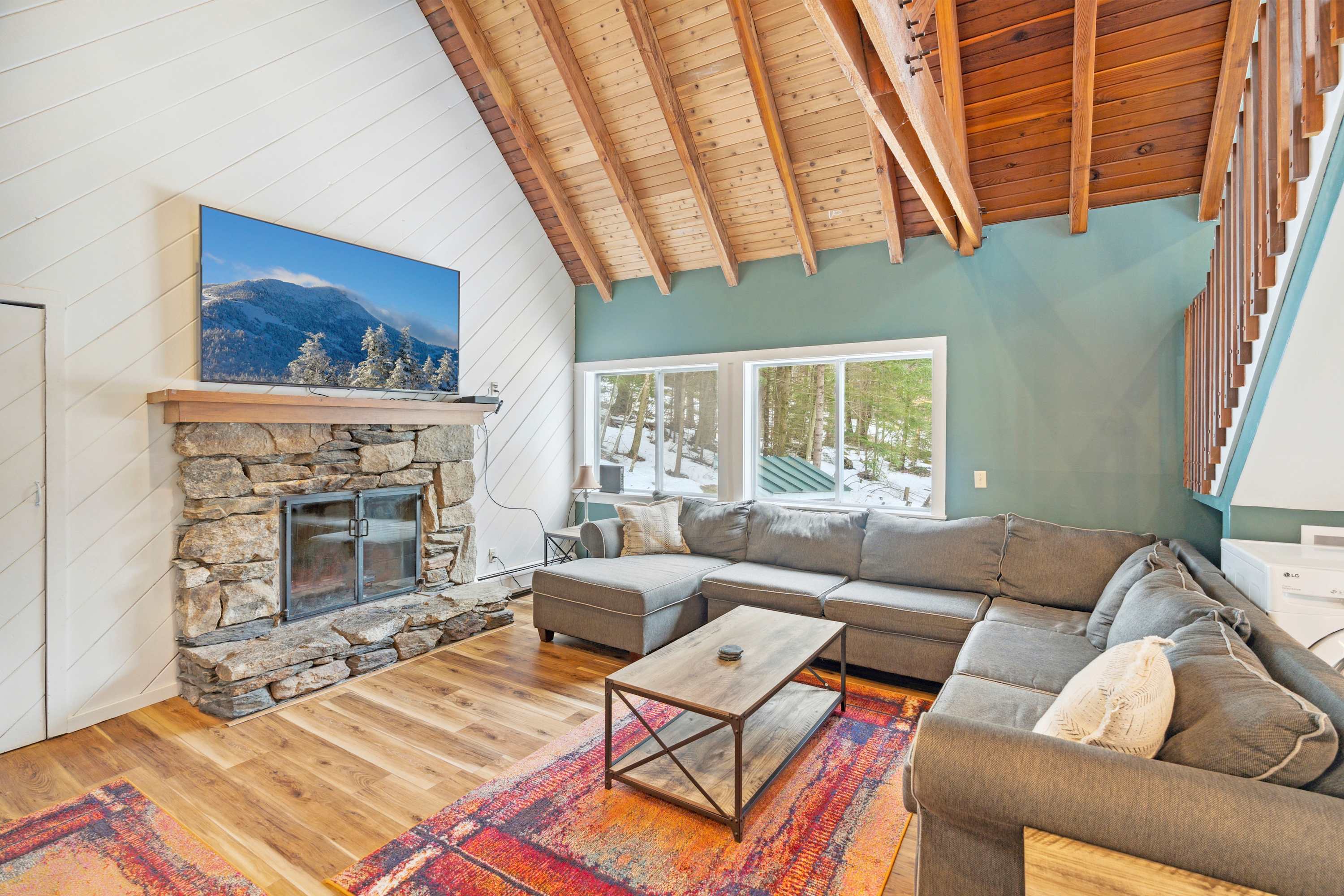 ✫ Cozy up in the living room, adorned by high ceilings and wood beams that make you feel cozy in your Vermont home. Furnished with a large sectional couch, 80” Smart TV with Netflix for movie nights. Books provided for additional relaxation time!